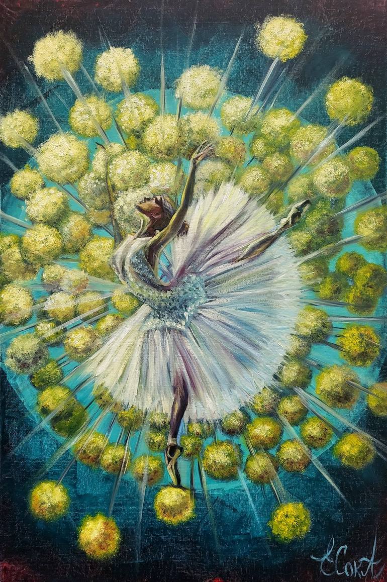 (Year 2024; oil on canvas board; 40×60 cm) The dancing ballerina in a delicate, light-colored dress symbolizes lightness, grace, and inner freedom. She represents the movement of the soul, its desire for harmony, and the expression of its true essence. This ethereal dance evokes a sense of carefree...