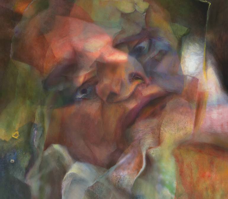 A vulnerable man who is surrounded by flowers. His vulnerability and innocence shows the amount of aggression. This painting is based on photography. The painting extends beyond the edges so that no frame is needed.