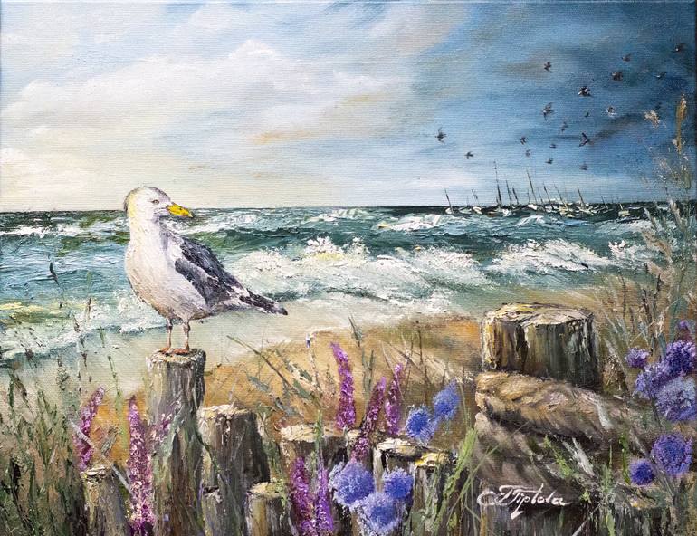 The picture takes us to the seashore on a summer day. The seagull is a symbol of freedom and independence, it is one of the first associations with the sea and represent the beauty and tenderness of wildlife. «The Seagull by the sea» is oil painting on canvas. size: 35:45cm, or 13,8':17,7' The canv...