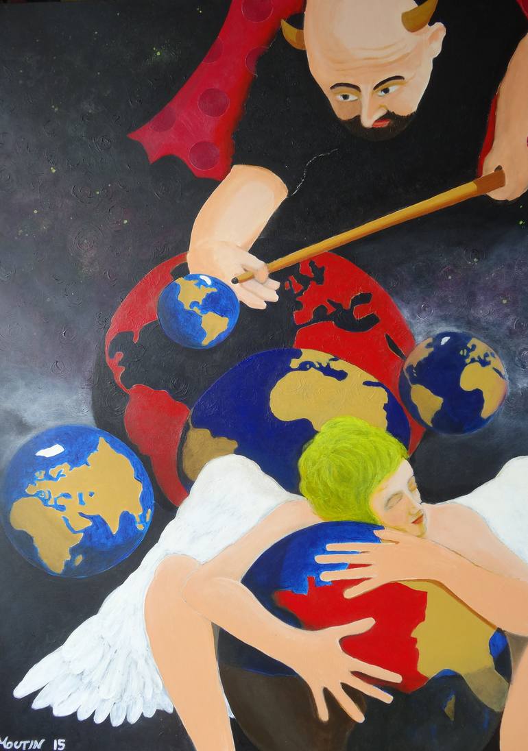 Le monde aux mains des forces supérieures du mal et du bien. Le diable jouant avec les planètes. Un ange essayant de protéger la terre. Cette toile est présentée au Salon International du Puy en Velay du 8 au 25 août 2018