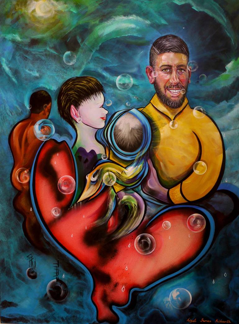 This painting is Nigel James Kilworth’s modern day 2016 interpretation of (Mr and Mrs Clark and Percy) a painting by British artist David Hockney. Painted between 1970 and 1971. Nigel depicts modern satisfied man with modern hairstyle and of course those white teeth, adoring partner, baby and bubble...