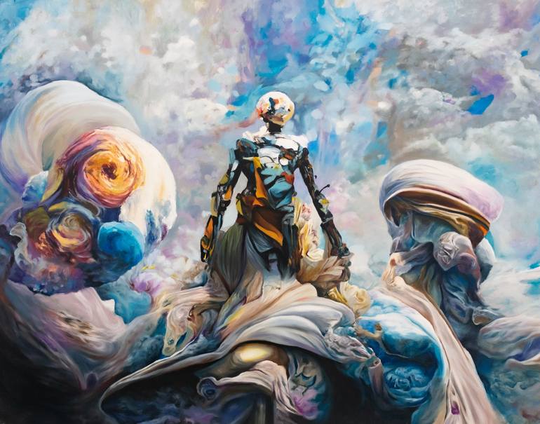 The title of the artwork is a reference to the Tin Man from "The Wizard of Oz," who famously sought a heart to become more human. In my painting, the Tin Man has transcended his original purpose and become something greater - a new god, watching over humanity. The use of metaphor in this painting i...