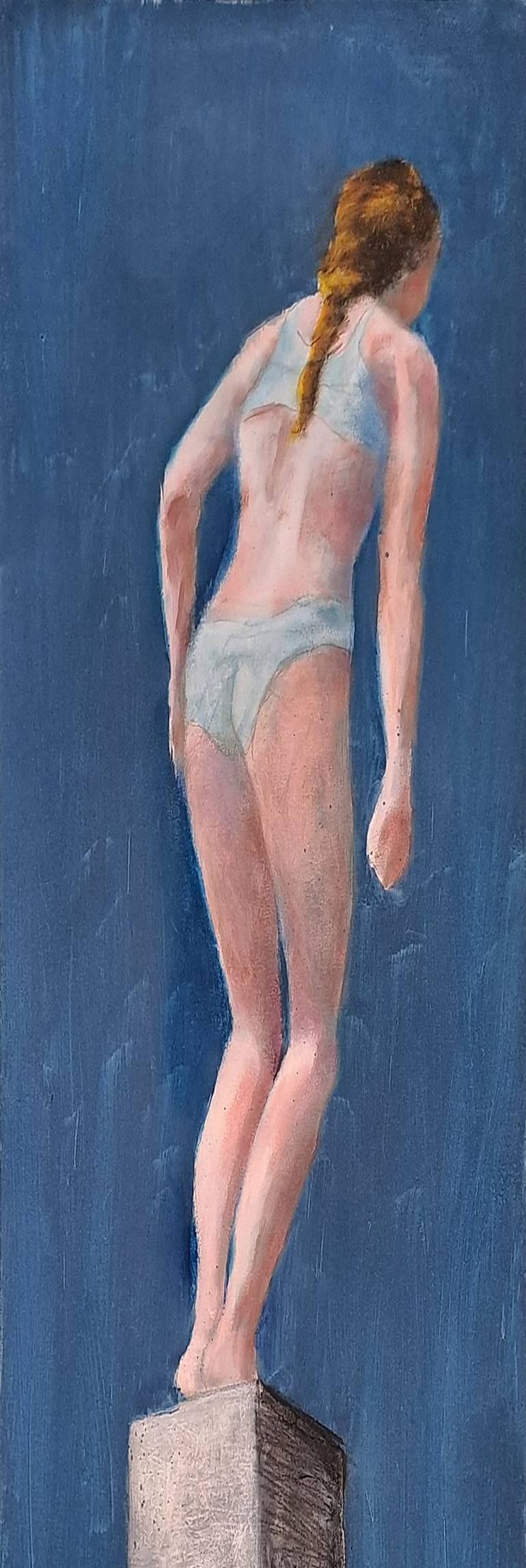 A young girl, in a fragile position on a huge piedestal,looking for something in a bluish space, maybe for an answer?