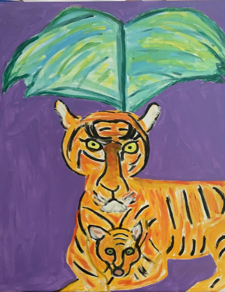 I was reading a novel about a man who kept tigers on his estate. The Mother tiger was very protective of her cub. I started to visualize it. I love the way animals are so protective of their young. Canvas stretched on wood. The sides are painted the same purple as the background.