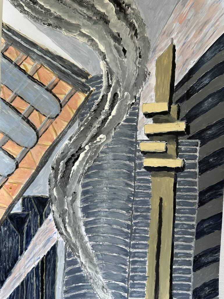 This painting features an abstract cityscape with towering buildings, depicted in geometric shapes and bold lines. A central spiraling form, resembling smoke or wind, rises between the skyscrapers, adding movement and energy to the scene. The use of muted tones like gray, yellow, and blue contrasts ...