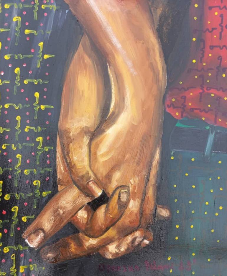 Olaosun Oluwapelumi born 1995. Olaosun Oluwapelumi is a passionate artist who dedicates herself to creating positive change in the world through her art. Her medium of choice is acrylic and oil on canvas, and she spends days working on each piece to ensure that it expresses her emotions and connects with her viewers. Olaosun draws her inspiration from her life experiences and everything that touches her feelings. She is particularly interested in conveying messages on gender inequality problems, social issues, and African history among other issues connected to black people. Through her art, Olaosun aims to create a connection with her viewers, making them feel the vehemence in the story she tells. The process of researching and working with different materials has brought Olaosun new challenges, and new ideals, which encourage her to continue creating multiple layers in her artwork. Her dedication to self-teaching has allowed her to develop her skills in pencil and paint and has given her the confidence to express herself through her art. Olaosun Oluwapelumi was born and raised in Osun State, Nigeria, and currently resides in Ibadan. She holds a BSc in Geography and Planning Science from Adekunle Ajasin University. Her passion for art has been a lifelong pursuit, and she continues to hone her craft with every piece she creates. Olaosun believes that black is not just a color, but our existence, and she uses black skin in her work to convey this message. Olaosun's works have been exhibited in galleries and art fairs both locally and internationally. She continues to create art that sparks emotions and creates positive change, and her works are a testament to her dedication to her craft and her desire to make a difference in the world.