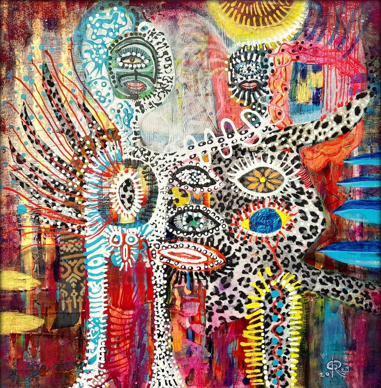 This work has developed slowly and in many steps and layers. A strongly abstract couple in a magical connection - filled with vibrant lightness and high spirits. Collage elements were used in the background; With the archaic figures, connections were created with many ornamental lines, which symboli...