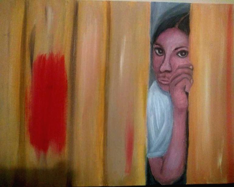 TRAP, A young girl/female who trap emotionally possible physically, not able to speak to any one about her abuse or loneliness, lock in by her abuser, the red paint represent blood , unfinish marks left by the abuser, This piece has many meaning It represent how some of us feels sometime trap int...
