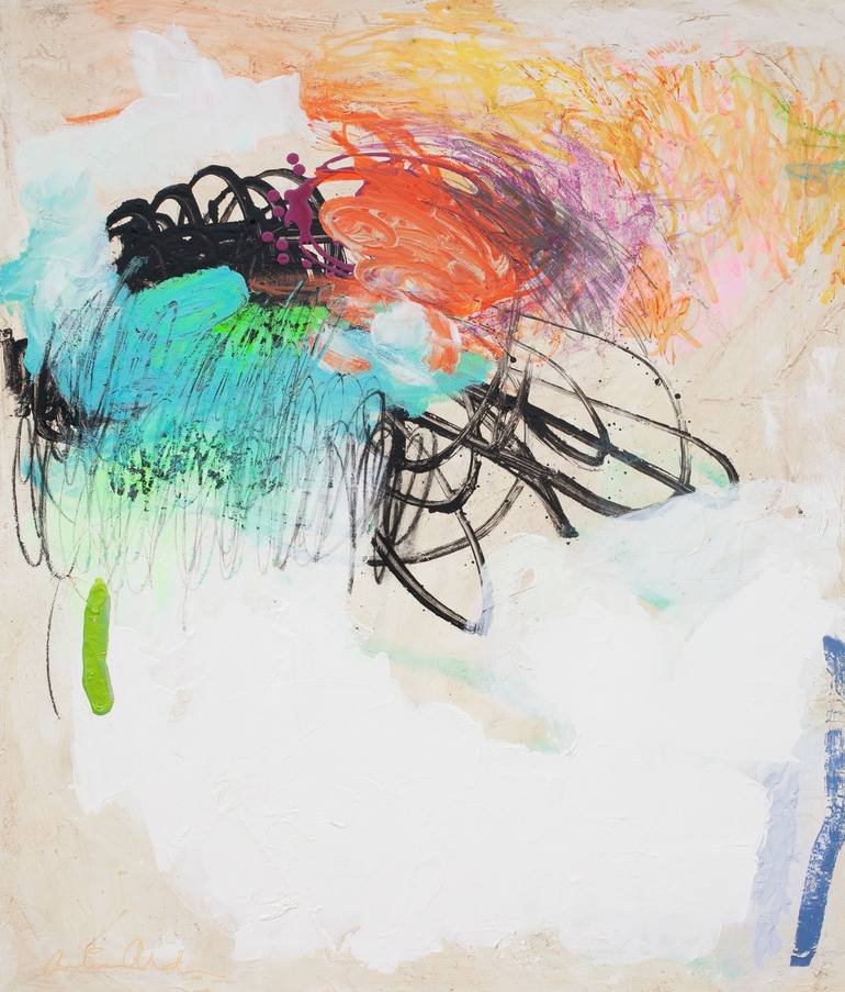 The paintings of Swedish born, Cyprus-based abstract painter Carolina Alotus (b. 1970) are luminous, fantastical arenas in which beauty and harmony negotiate fiercely with chaos. Her compositions are active and energetic, sparking visual tension from unexpected relationships between colors, forms and textures, and from the feverish juxtaposition of seemingly disparate mediums and techniques. “As an abstract artist, my work is a continuous exploration of emotion, movement, and the intangible forces that shape human experience. Created through a deeply intuitive process, my paintings emerge organically, guided by instinct rather than predetermined outcomes. I embrace spontaneity, allowing color, texture, and form to interact freely, resulting in compositions that feel both raw and deliberate. My art is not merely a visual expression but an invitation—an open-ended dialogue where each viewer finds their own meaning and emotional resonance.”