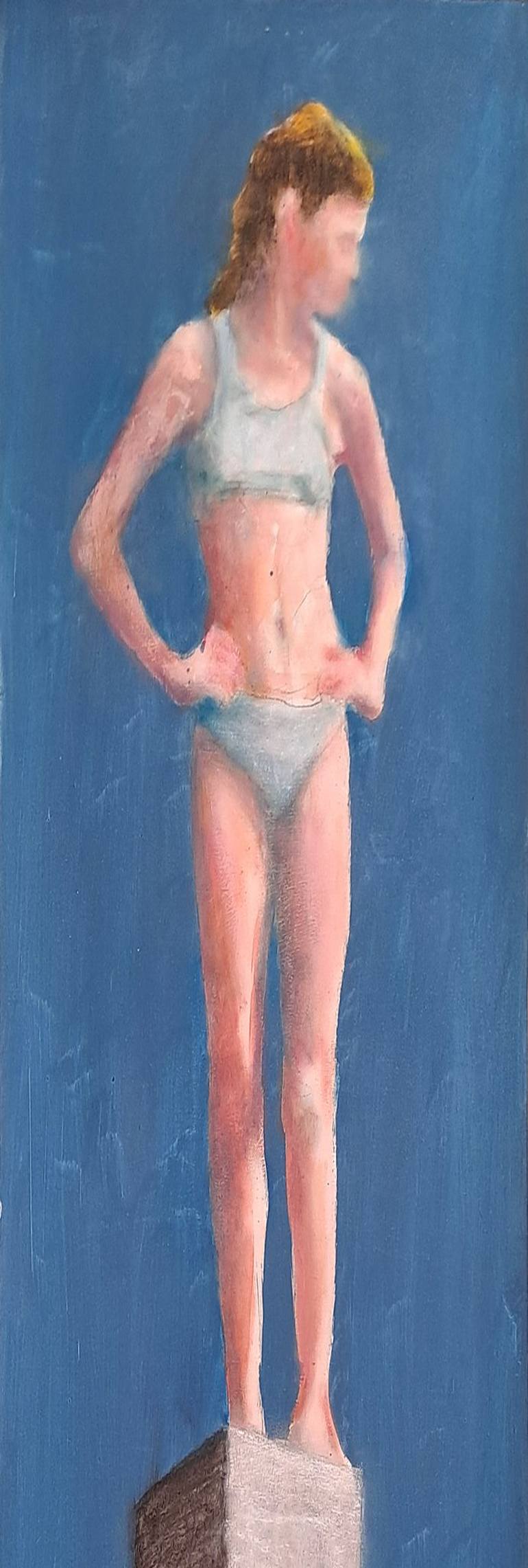 A young girl, in a fragile position on a huge piedestal,looking for something in a bluish space, maybe for an answer?