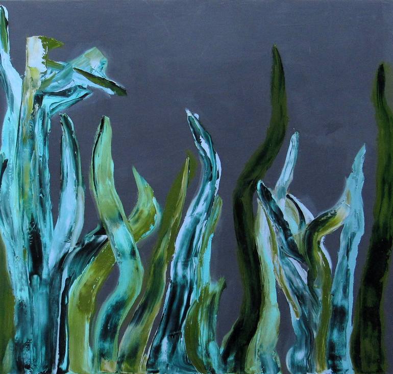 Abstract landscape, green, blue, with a gray background. Oil on canvas, 30" x 30" edges painted black, ready to hang.