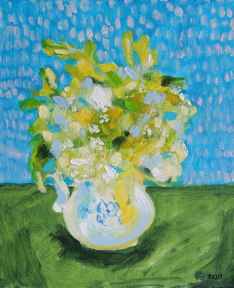 Tamara Jare rainy day bouquet oil on canvas contemporary still life flowers in white and blue jug small format wall art