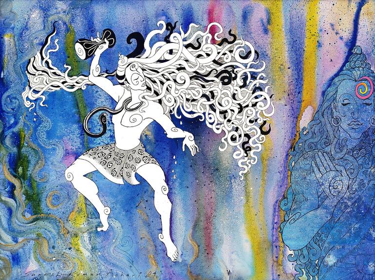 This painting is inspired by the poem Shiva Tandava Stotram which describes the qualities of Lord Shiva and this is the verse number 1.. 'With his neck consecrated by the flow of water that flows from his hair, And on his neck a snake, which is hung like a garland, And the Damaru drum that emits ...