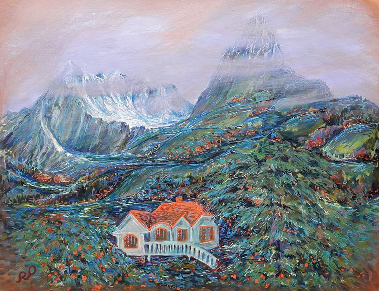 Original painting "Tangerine house" Size: Height 18 x Width 24, Depth 0.6, Inches. Materials:Acrylic on canvas, Acrylic Pens. Subject: Landscape. Style: Impressionism, Contemporary, Modern.