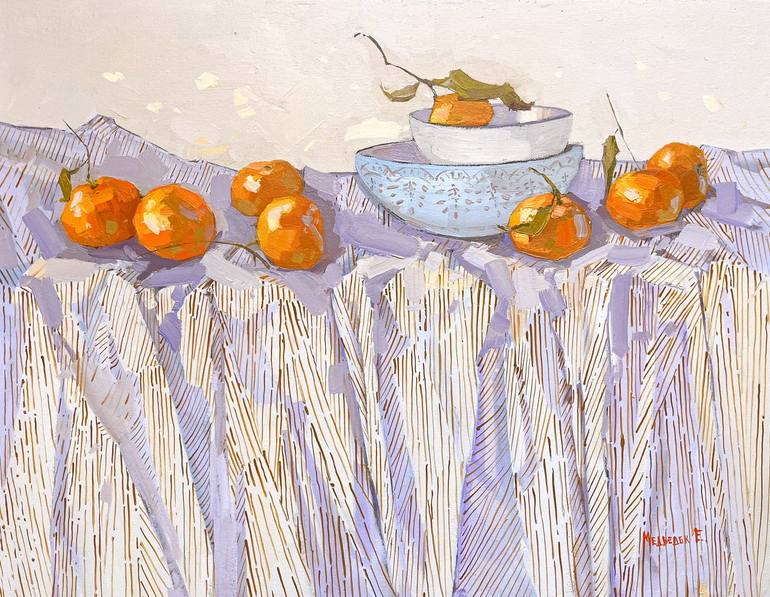 This painting captures a quiet morning moment — simple, yet full of light and life. I wanted to express the fragile beauty of everyday objects: the soft folds of the tablecloth, the brightness of mandarins, the calm balance of ceramic bowls. The composition and textures reflect my love for sunlight,...
