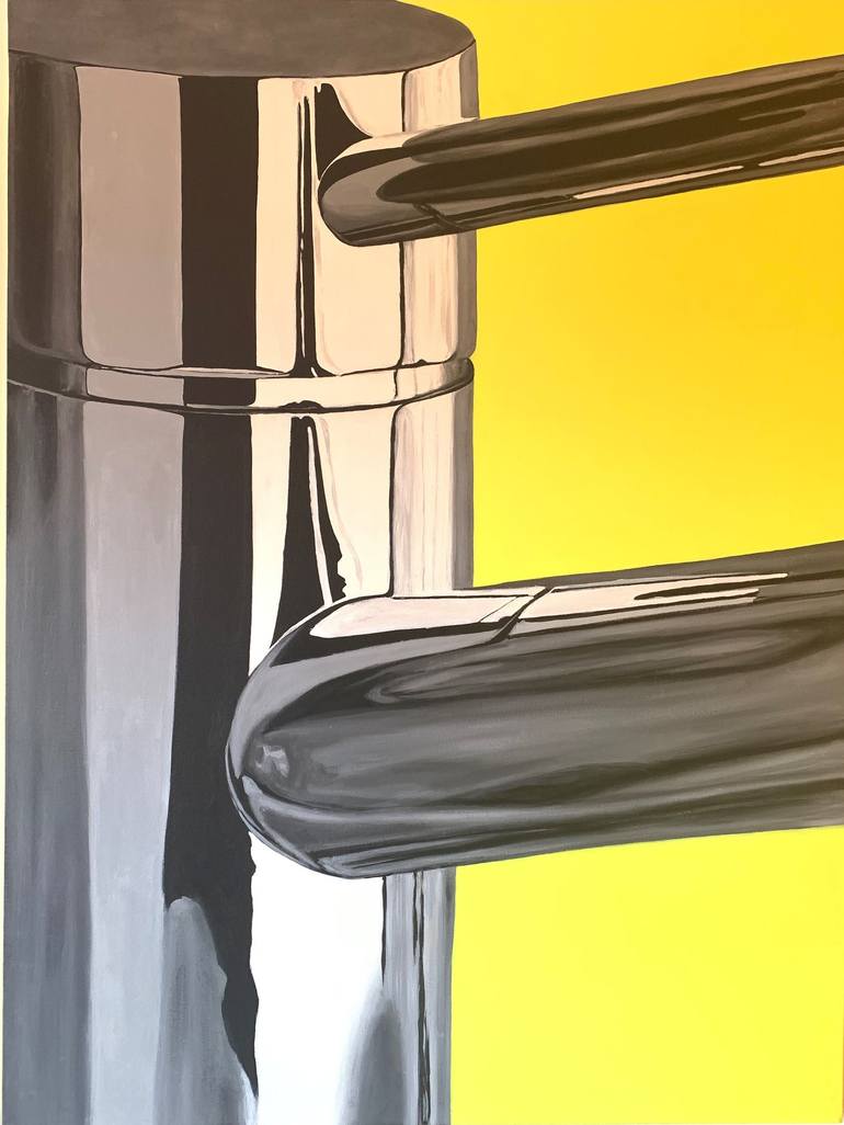 This painting is a comment on all the wars taking place in our modern world. The metal surface and almost agressive aim of the horizontal tap handles alludes to military tanks and the inclusion of this piece in a triptych comprising the "Great Danes" and "Chips" paintings add to the allusion of rubb...