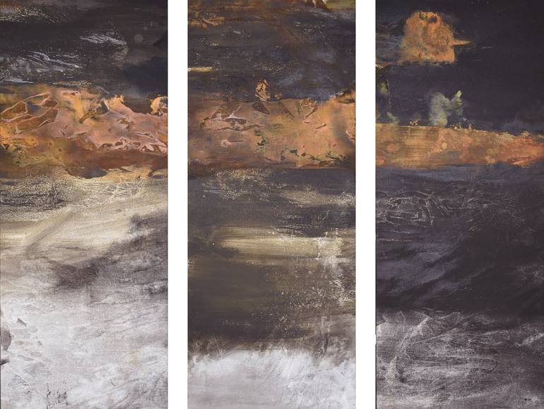 Inspired by the song of the mines of my land. The deep search line. An inward search to find the wealth of the earth. An expression of the strength of the human being, of deep transformations and the search for reality. Triptych made with a mixed technique of pigments, iron and acrylic on 300 gram c...