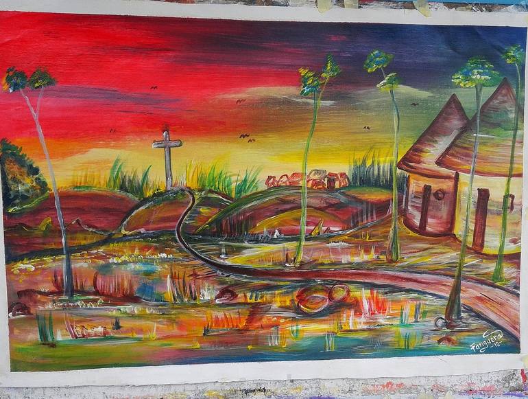 ici cest mon paysage . une village tata somba de natitingou dans le nord du BENIN . La croix que vous voyez cest un lieu saint saint des chrétiens en haut des montage permettant a tout les d'y aller prier . la dimension est 95x65 cm . acrylique sue toile . vendu a virginie w au usa . je suis apte p...