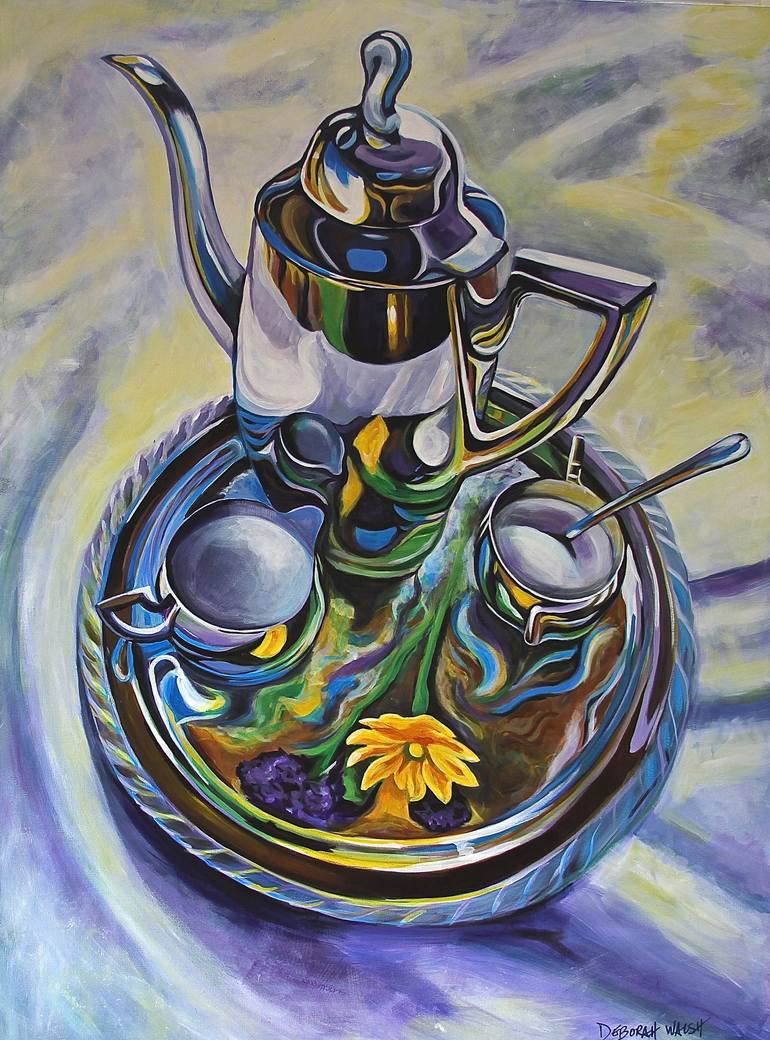 Reflective objects are a favorite subject of mine and this tea set caught my attention! The composition is full of movement, variation, and repetition. I love using acrylic paint as it allows me to make changes quickly.