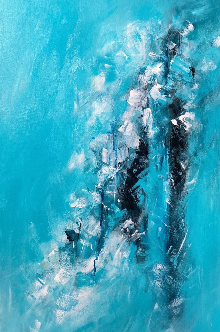 A textural abstract artwork painted in teal blue, black and white. Base layer consists of light teal blue with runs and drips; with texture added in layers. The effect is that of gushing white water with foam spraying in every direction. A little black shines through like the rocks breaking the rhyt...