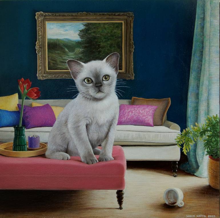 This painting is from a whimsical series of giant kittens in beautiful interiors. It is painted in a realistic manner, although I am playing with scale, since the kitten is impossibly large for the room. The kitten's eyes meet the viewer's gaze, and its serious expression seems to suggest that it wi...