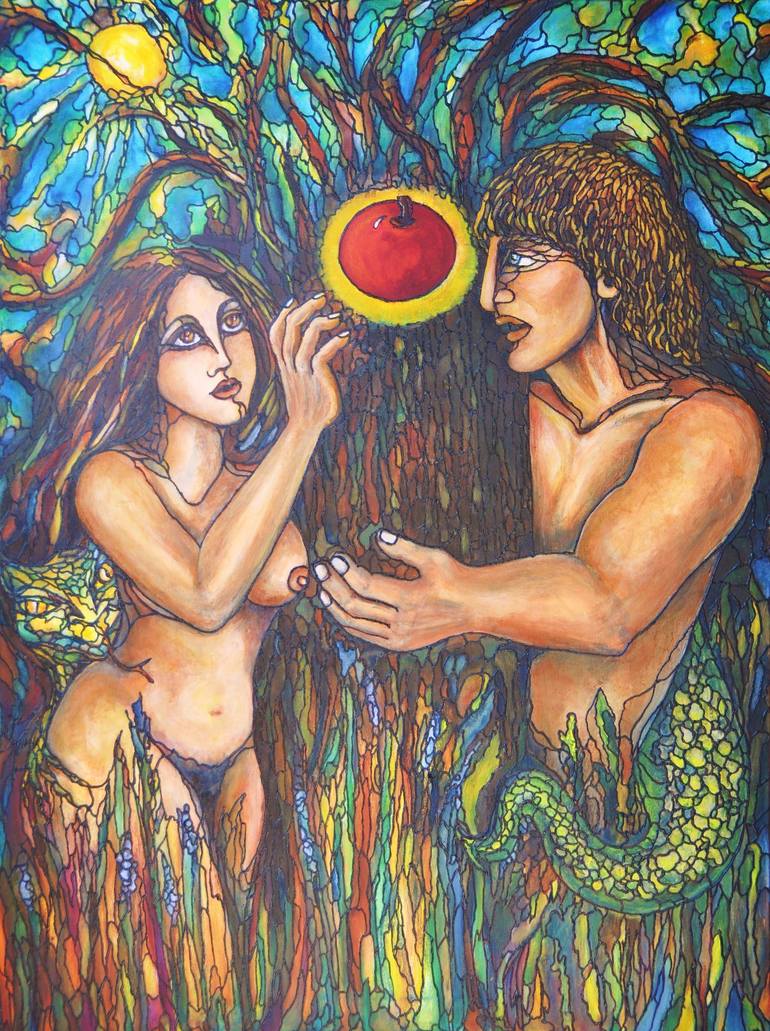 This painting depicts Adam & Eve on a verge of picking the "forbidden fruit" – mesmerized by temptation despite their confusion and fears. This painting the original and is part of my "biblical" series. However, more than being a traditional religious art piece, it is symbolic. It's done in my o...