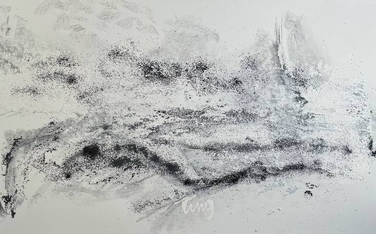 This artwork presents a mesmerizing abstract landscape, dominated by shades of black and gray, evoking a sense of ethereal mystery. The composition is a dynamic play of light and shadow, where textured brushstrokes create a sense of movement across the canvas. The artist employs a technique that res...