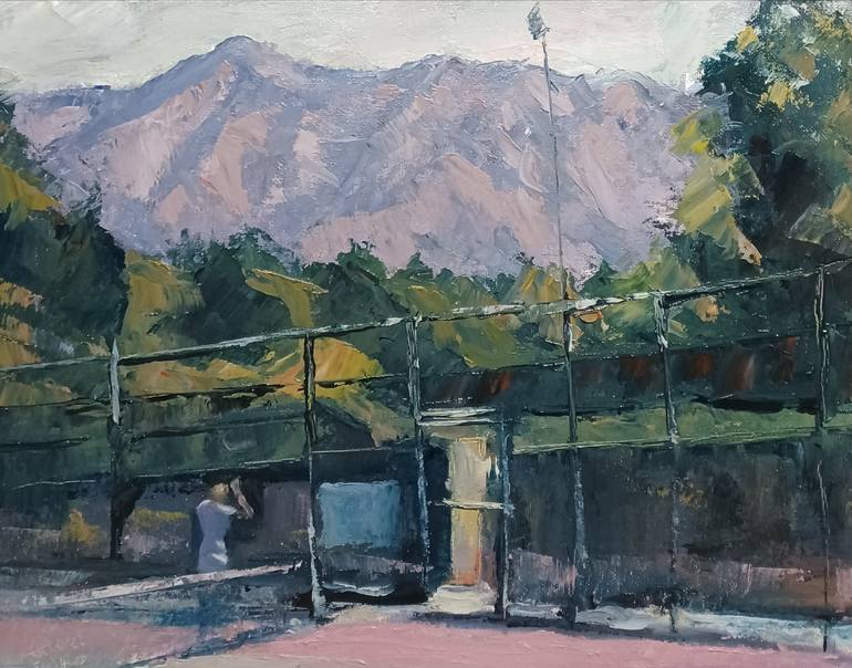 "Tennis Court Oath" is an original oil painting, a small window into the landscape of Southern California. The canvas captures a view of Monrovia Peak as seen from Sierra Madre. Brushstrokes of color create an impressionistic and modern scene. The artist's hand translates the natural world using th...