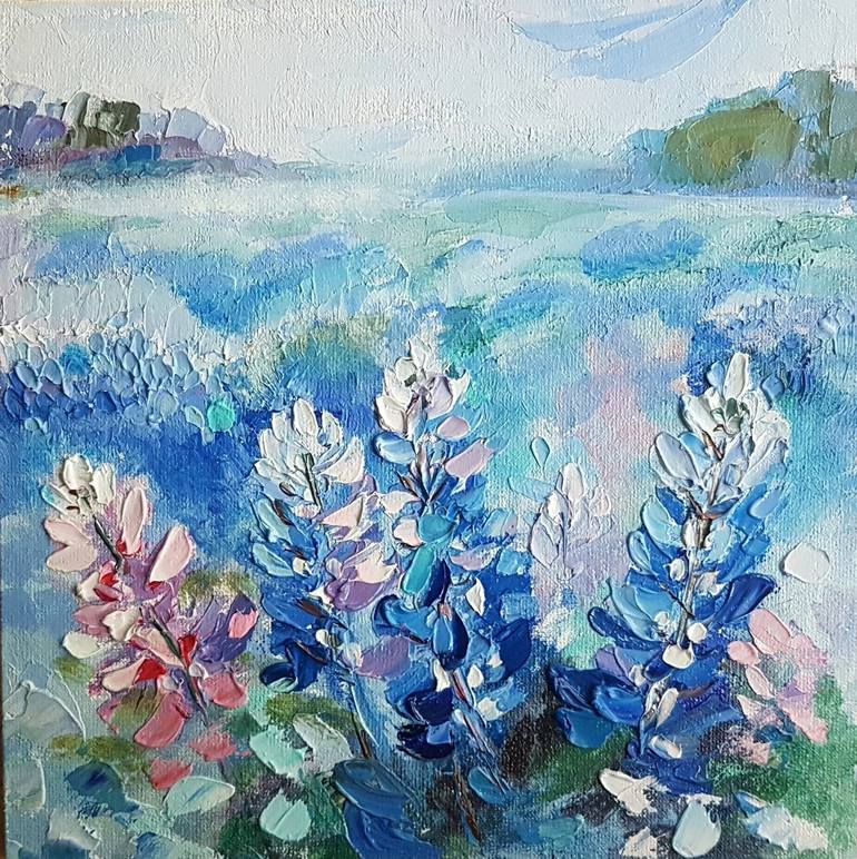 My miniature painting (8x8 inches=20x20 cm) has a thick texture and strokes that can be seen. Artwork was created with palette knife. This gives the picture more saturated colors. Immerse yourself in the vibrant beauty of Texas with this captivating small impasto oil painting of a blooming Blueb...