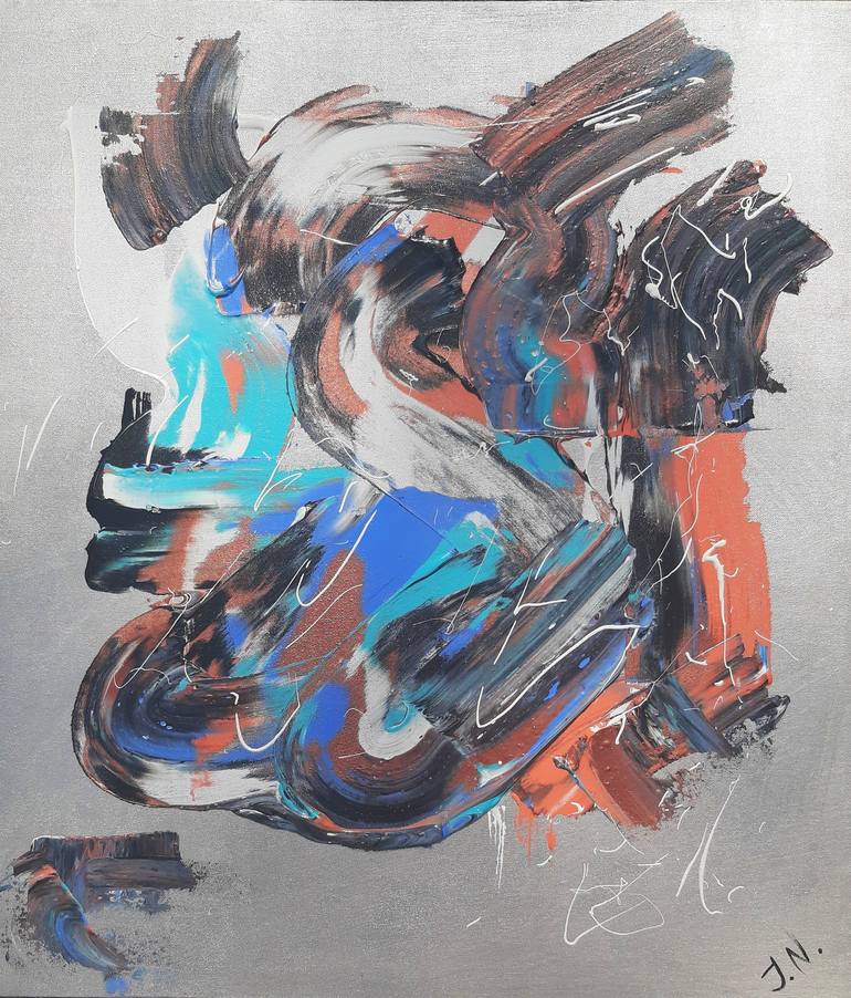 Wide chaotic lines are mixed into a single drawing on a silvery background, the 3D texture of the picture creates the impression of penetration into the drawing itself, a beautiful combination of coral, turquoise, white, black colors. The uniqueness of this painting is that everyone will see in it t...