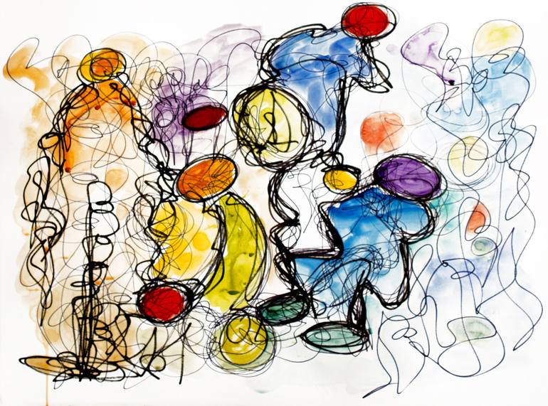 This artwork comes to life through mixed media: acrylics, oil markers, and watercolor. The composition showcases a playful scene where figures gracefully emerge, outlined by fragile lines. This intricate interplay of mediums creates a tangible and sensitive atmosphere within the artwork, inviting vi...