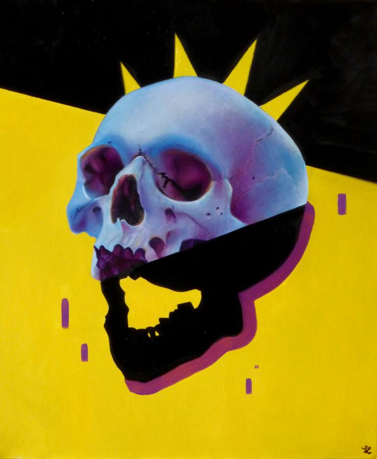 Oil on box canvas ready to hang. A reflection of our own mortality and the event of death in all its big shiny glory and whatever if any adventure awaits us at the after party