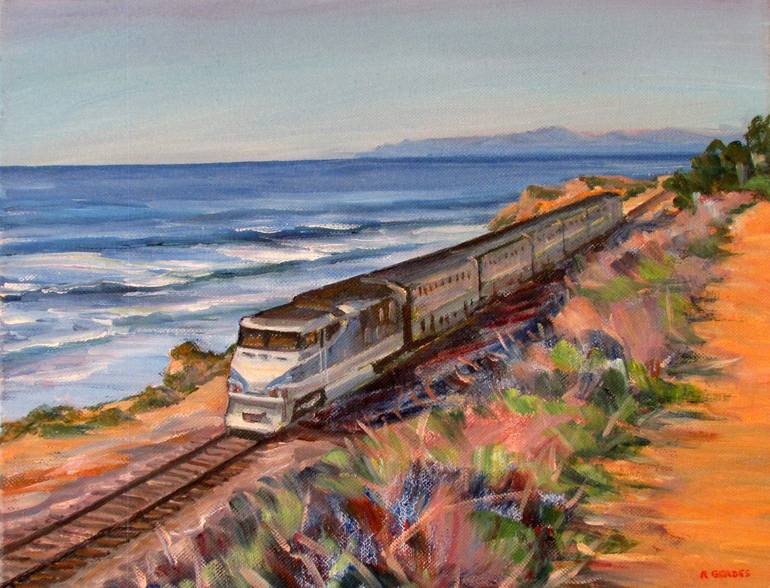 A view from the bluffs as the Amtrack Surfliner passes close to the beaches of Del Mar. It's destination is San Diego California.