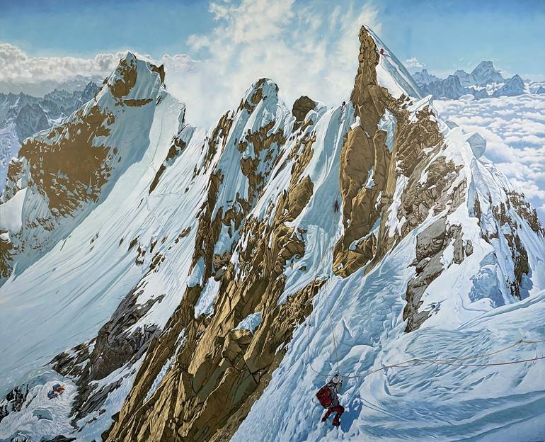 Alexander Heaton's work reaches deep into the imagination, searching for mans most primeval interaction with nature. His paintings attempt to capture that first interaction, and the sense of wonder and spirituality as humanity confronts omnipresence. Alex works from experience, researching and conducting studies in remote natural settings. Through long and meaningful communion with nature his many drawings and paintings assert the inherent worth of deep spiritual reflection and recognise union with land and the elements. He also uses cut up techniques to sample found photography from retro mountaineering literature to journey to some of the more extream places on the canvas that he has not personally been able to visit. Alex often draws upon mystical experiences and noetic connections to illustrate in paint the words of the divine presence felt in the places he chooses to depict. He draws upon such wells of references as shamanism, mythology, gnosticism, extreme sports, and ecstatic mountain lore. Landscape Artist As a mountaineer Alex, studies and researches themes directly. He often thinks nothing of walking and climbing to remote places in the Himalaya or Alps just to cast an eye on his artistic muse – "I am the lonely figure lured by mountains, dark forests, alpine skies and forbidding ravines." The paintings look out from dreamy summits and contemplate the beyond. Through his canvases he continues on the Romantic journey, but updates this visual language with the possibility of going to higher, more challenging and steeper places. "My work teeters on the edge of a filmic realism and also at times uses sampled vignettes of other climbers photographs." There are hints of something more transcendant in the dark forests and crumbling glaciers that populate his works to date. It’s this struggle that fascinates him to keep painting. Recent works transports the viewer to hallucinatory and altered worlds. These are not real places, but are constructs of sublime vistas I have experienced or sampled. The work touches on a common longing in us all to escape the modern urban landscape and throw oneself whole heartedly into serene expanses, and witness at first hand awe-inspiring natural phenomena. This isn’t always possible on a day-to-day basis, but painting as substitute for exploration can be. However, the work at times offers us dangerous realities of complete desolation or abandonment at the ends of the world.