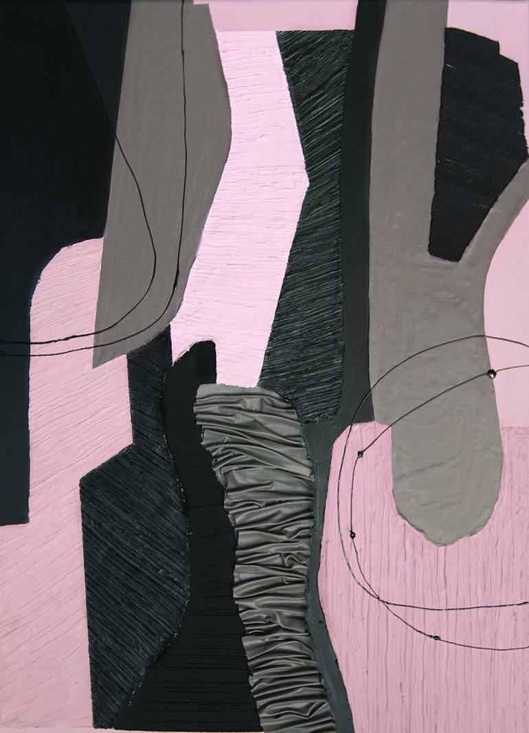 This painting from the The Assembled Whole series is created on canvas using a collage technique with various textured materials. The composition features soft pink, gray, and black tones, harmoniously blending to create an abstract and modern aesthetic. The work incorporates elements made of faux ...