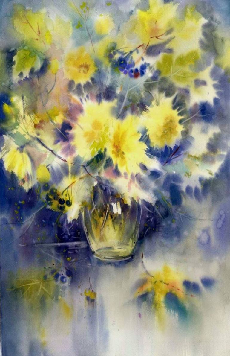 Autumn stars. Flowers in watercolor. 38"56 Autumn flowers look like stars, asters, chrysanthemums, dahlias. Especially white and yellow. They glow like lanterns. And on a blue, cold background they shine especially. As in this watercolor painting of mine. It was not by chance that I chose th...