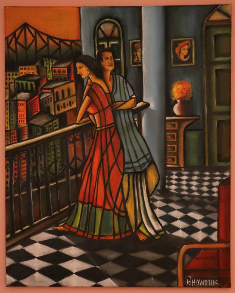 A couple enjoying the beautiful evening sunshine in the Indian city of Kolkata with the famous Howrah bridge in the background.