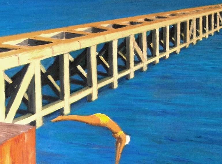 Three bathers dressed in swimsuits from the 40s enjoy a warm sunset at the sea’s shore. They use as a platform for their dives an old concrete and iron structure that juts out into a blue-green sea, in which, far away, some sailboats unfurl their white sails. The structure is an idealization of the...
