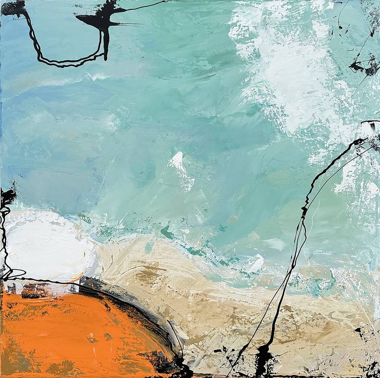 This original painting titled "The Beach" is a mixed-media, abstract, contemporary artwork on canvas. This artwork features layer upon layer of unique textures, oil pastels, and acrylic paint. This artwork can be characterized as contemporary, minimalist and abstract with sea-scape tones.