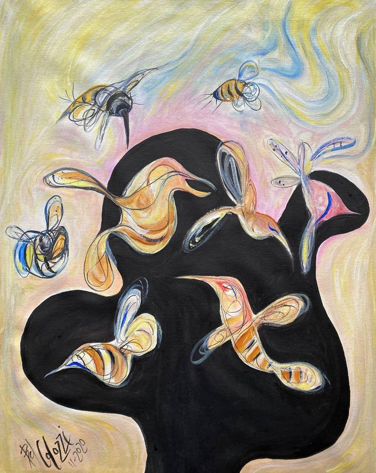 The Birds and The Bees was inspired by Ravel, the birds and the bees, love, and life. The Birds and The Bees is painted on canvas and not framed. There are 1.5 inches all around the painting so it may be wrapped around a frame or mounted. The canvas will be delivered rolled up and in a tube. *...