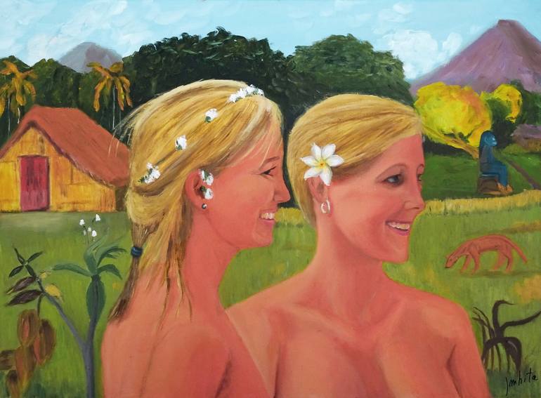 Two blonde girls, probably from a Nordic country, smile in a sunny place. The painting is inspired by the work of Paul Gauguin at Tahiti, in the pictures painted in that island, where a series of recurrent elements are usual: girls (no northern blondes indeed), huts, prairies, plants, animals…and i...