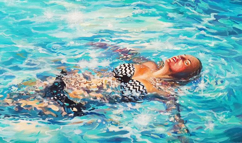 Tranquillity. Swimmer Large Paining. Original large painting on deep canvas size is: 30 X 24 inches. or approx. 76cm x61cm x4cm This scene is in a series of “Moment of Life” paintings. The painting continues around the edge and it may be hung unframed. The human is always harmoniously connected wi...