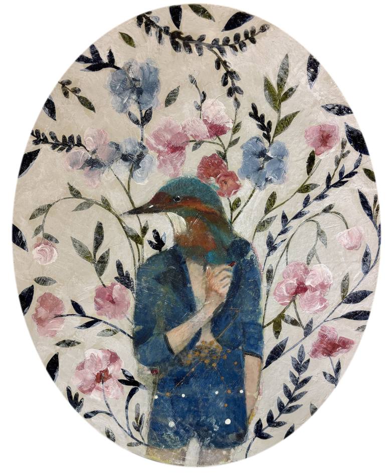 In this work, I explore the intersection between human identity and the natural world through the figure of a woman whose body remains human, yet whose head has transformed into that of a bird. Her dress, in soft blue tones, evokes stillness, depth, and introspection—qualities often associated with ...