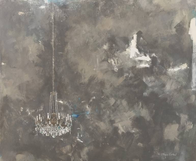 Acrylic on canvas, textured, moody, atmospheric. Detailed chandelier in contrast to expressive, abstract background.