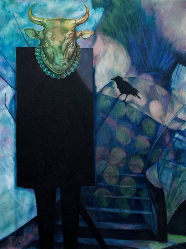 This painting was developed from one of my original digital works of art that combines multiple image layers and drawings to create a unique piece. I then used that and edited it again, changed the dimensions and some of the content. The Bull/Judge has always been the main focus of the piece. Inter...