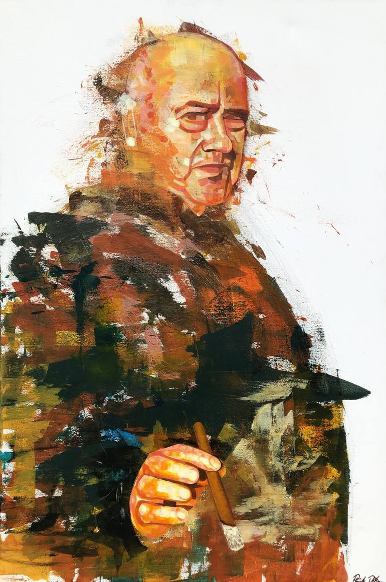 This portrait is of a local elderly man I encountered in Pollensa, Mallorca during the Sant Antoni festival. I was drawn to his facial character and the imposing quality he possessed, on photographing him I realised I wanted to produce a painting. I wanted to let go and experiment with the paint an...