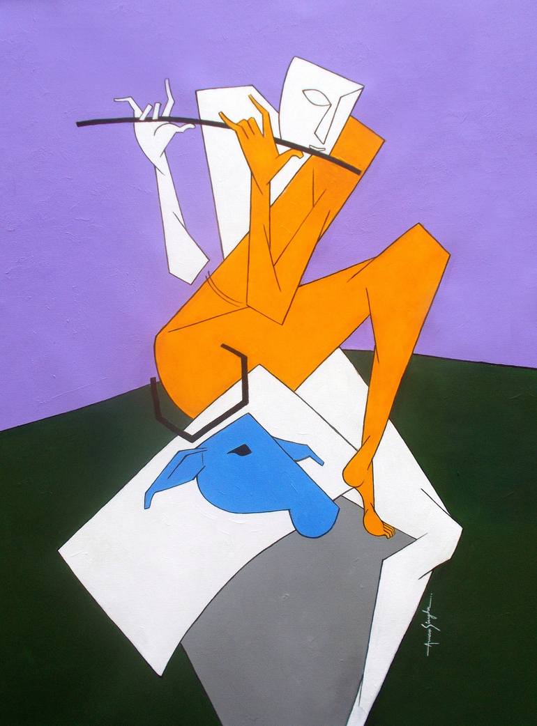 Born and raised in a baronial family in North Bengal, Amar Singha was fortunate to be thrust into a world of creativity at an early age, where colored pencils, crayons, and drawing sheets offered great solace from the kind of loneliness that accompanies stately culture. The flash of royalty that made up the world around him fostered his curiosity for deeper exploration, which he began to discover as soon as his pencils and crayons hit the paper. What was considered child’s play at that age catapulted him on a lifelong journey in search of greater truths, freedoms, and simple joys. Along the way, Singha picked up credentials from the Academy of Creative Art in Kolkata. In his final year of art school, he lost his father, which further flung him into the depths of an interior search—one that can best be described (insufficiently so) as a deep dive into the spiritual realm, an exploration into impermanence activated by those questions of life and death that plague us all. For about 16 years, Singha essentially disappeared from public life in order to listen closely for whispers of truth and emerged again using paints and brushes to translate the untranslatable through his art which he births in his home studio in Raghunathganj, a small village in West Bengal. STATEMENT - A conversation between ancestral Indian lineages and synthetic cubism allows me to prominent my emotions expressively. The use of colors demonstrates my sentiment that works to find hidden lofty things we usually ignore. The color itself becomes a subject that whispers for my sensation. Simplifying the composition produces uncluttered spaces that sometimes create a feeling of boundless joy followed by the expression of colors or sometimes inexplicable sensitivity of the subconscious mind. It also brings a calmness that immerses me deeply in the spiritual realm, followed by the past spiritual experience that makes sense of my creative spirit. A subtle emotional approach transforms my form into an abstraction that steadily expresses by line drawing. Drawing is a pivotal factor in my painting that help viewers discern the insides despite the abstract approach of my artwork. Amorphous brush strokes with acrylic paint create a little texture, but finally, it produces a calming smoothness that I enjoy. I then start drawing lines to make the details. Seeing how the object reveal under several abstract shapes in the painting cheers me.