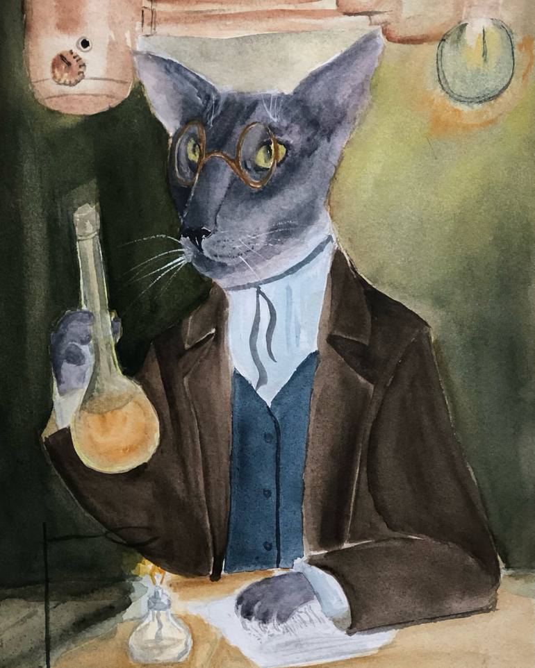Enhance your space with this vintage-style watercolor painting featuring a scholarly cat scientist dressed as a Victorian chemist. Perfect for cat lovers and science enthusiasts, this unique piece portrays a distinguished feline chemist holding a flask, adding a quirky and intellectual charm to any ...