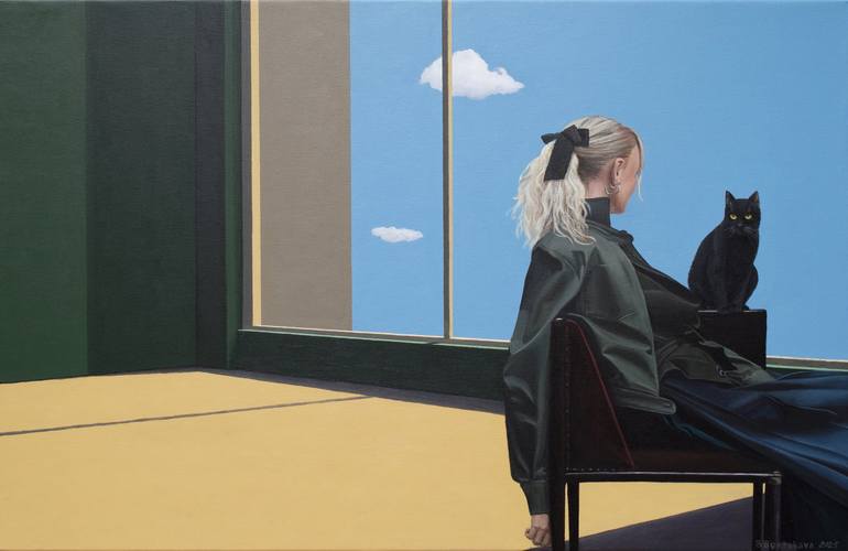 A woman sits in a sunlit room with soft geometric lines and a peaceful color palette of green, beige, and blue. A black cat rests on her lap, staring out the window at a calm, blue sky. The mood is quiet and nostalgic, evoking stillness and reflection. The realistic style, accented with abstraction ...