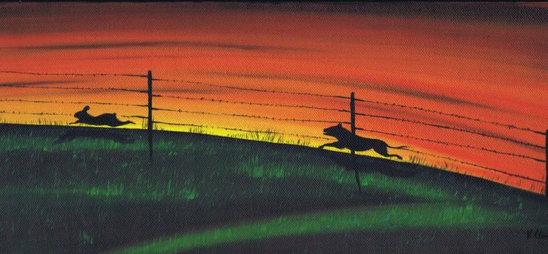 I hope viewers will see the funny side of one of my early landscape painting here with an angry dog chasing the rabbit across an open field. Kind of like the old cartoons where the dog chases cat, cat chasing mouse, road runner being chased by coyote.